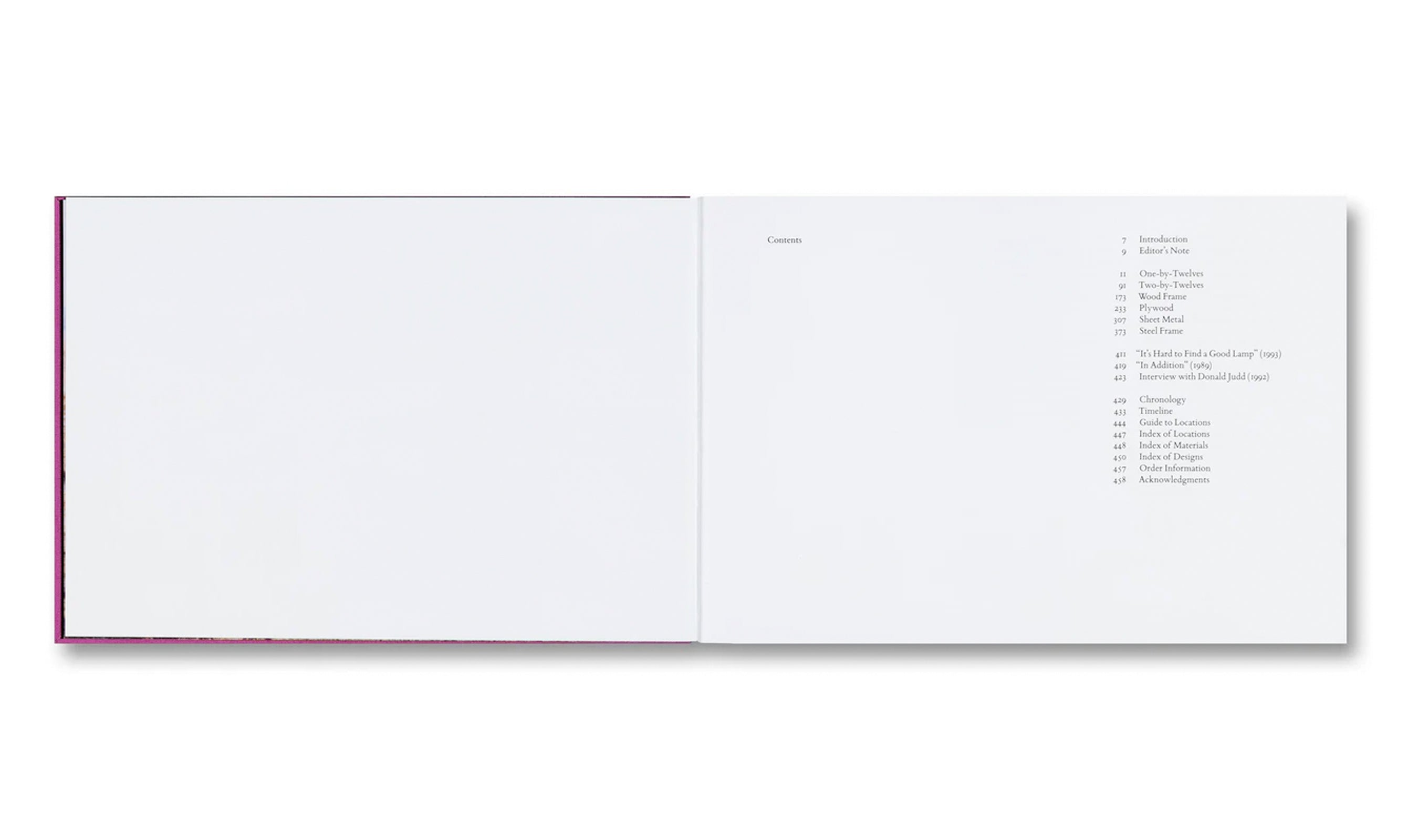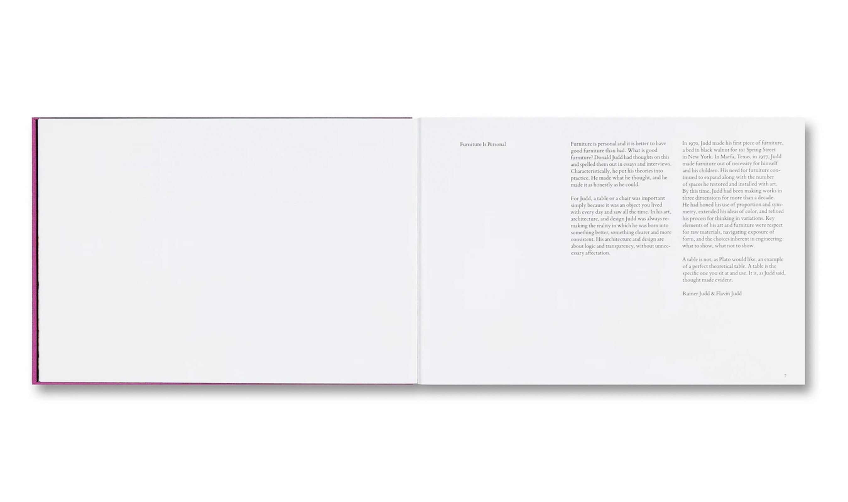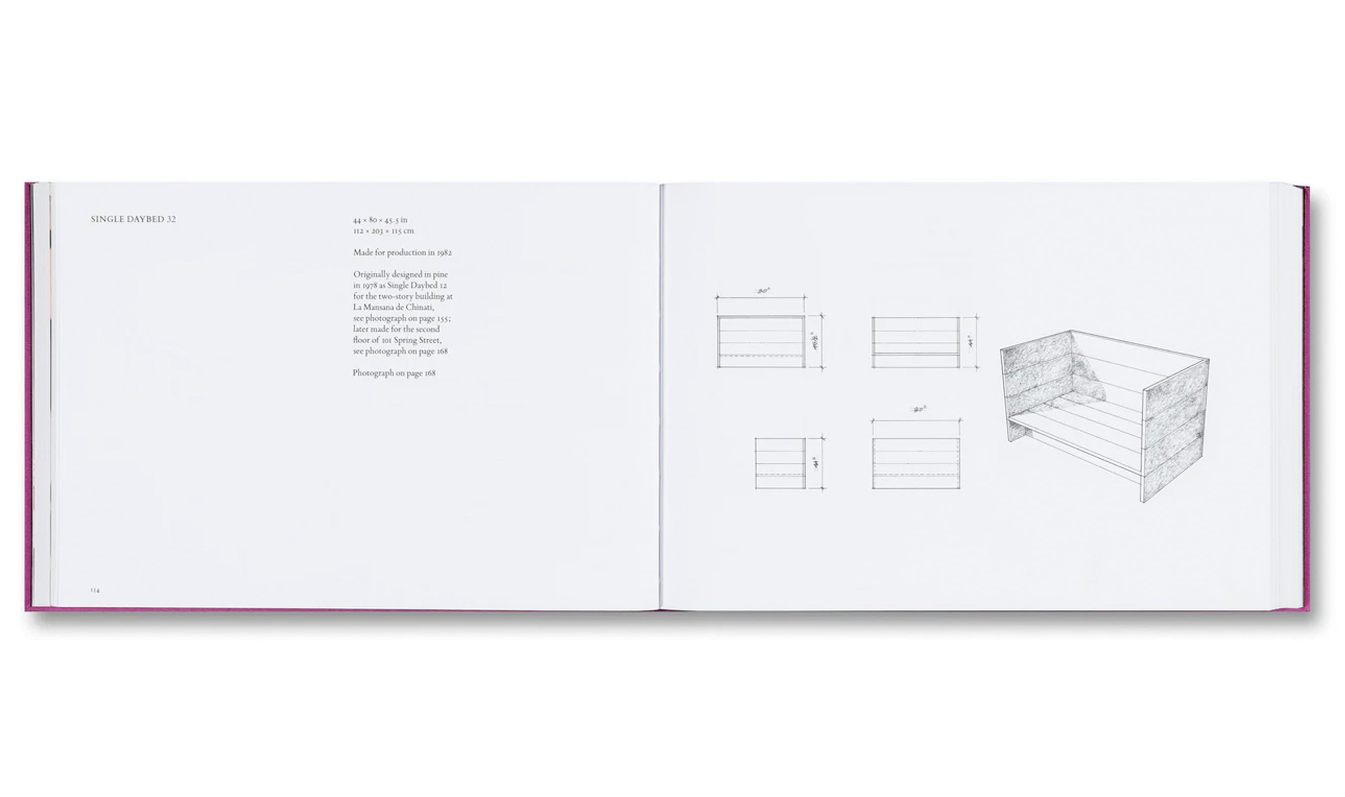 Donald Judd Furniture includes more than one hundred pieces of his furniture, spanning 1970 to 1991, designed for his living and working spaces at 101 Spring Street and in Presidio County, Texas. The publication introduces readers to Donald Judd’s furniture designs, initiated during the renovation of his home and studio at 101 Spring Street in New York, and as the result of the difficulty Judd later had in furnishing his home in Marfa, Texas. These furniture designs exemplify the directness of form and presence for which his artworks are celebrated, as well as offering a distinct and unadorned functionality. In this book they are presented through detailed drawings and breakdowns of materials, and color photography exploring their placement and function within these spaces. As well as surveying a central aspect of his work, Donald Judd Furniture details Judd’s understanding of functionality, form, and his deep interest in the possibilities of design in a world of mass-production.