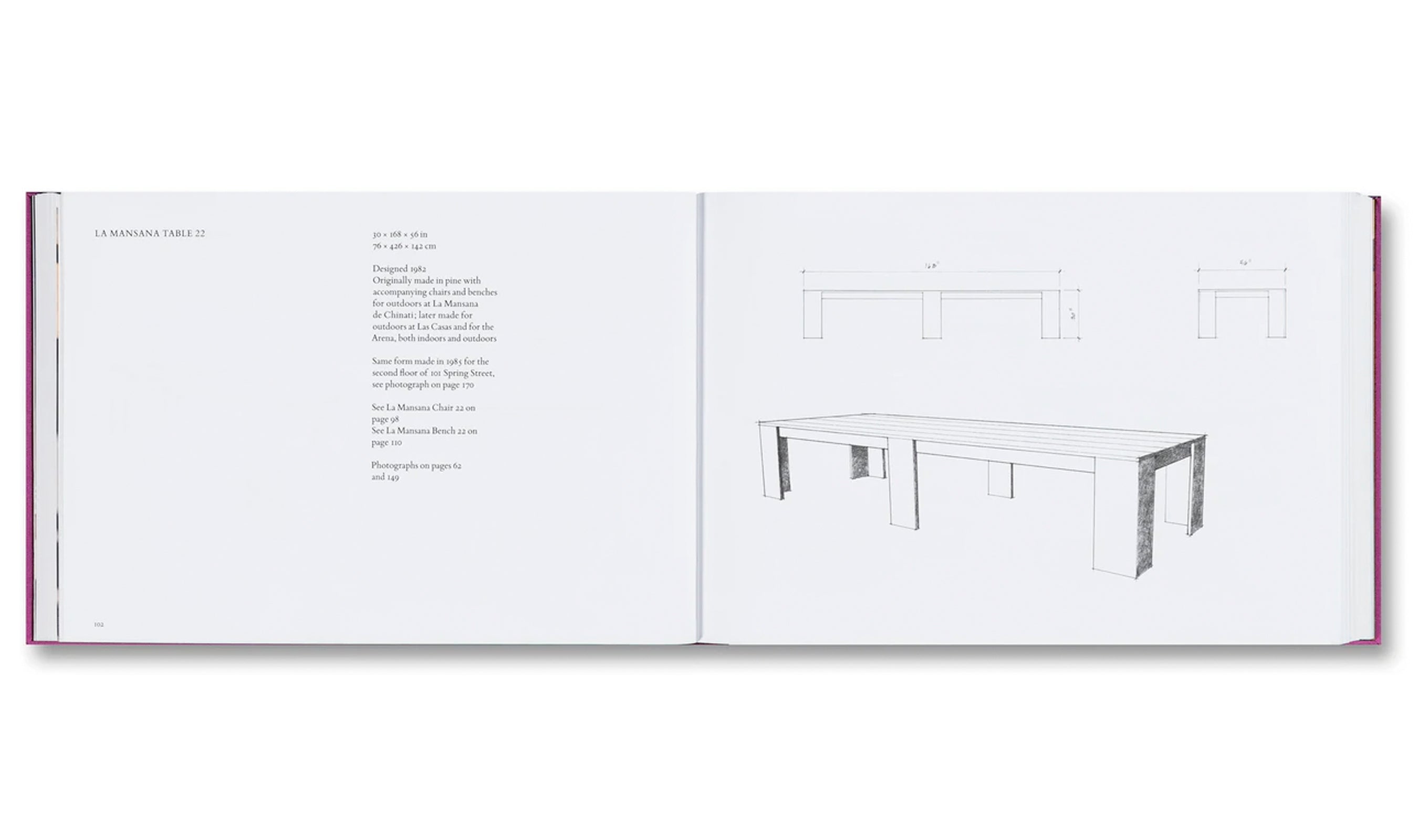 本書は、100点以上におよぶ作者のデザインによる家具を収録する。1970年から1991年までの間にニューヨークのスプリング・ストリートとテキサス州プレシディオ郡に建つ自宅と作業空間用に制作されたものである。家具はスプリング・ストリートの自宅兼スタジオ「101 Spring Street」の改築時に着手され、その後テキサス州マーファに建つ自邸の家具制作に苦心した結果生まれた家具のデザインを紹介している。