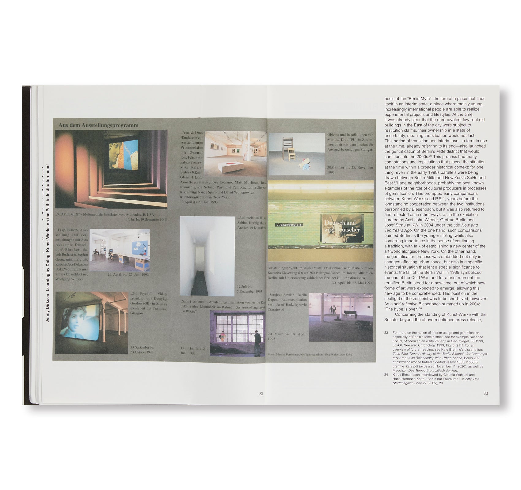 Released on occasion of the anniversary, this first comprehensive publication on KUNST-WERKE BERLIN e. V. is the fruit of Jenny Dirksen’s extensive research into the organization’s history. It presents selections from the sizable archive and unfurls a polyphonic institutional history, with a timeline running to over 300 pages, photographs, writings by Klaus Biesenbach, Jenny Dirksen, Susanne von Falkenhausen, Eva Scharrer, and Jan Verwoert, and recollections of contemporary observers and friends and associates of the KUNST-WERKE BERLIN from three decades.