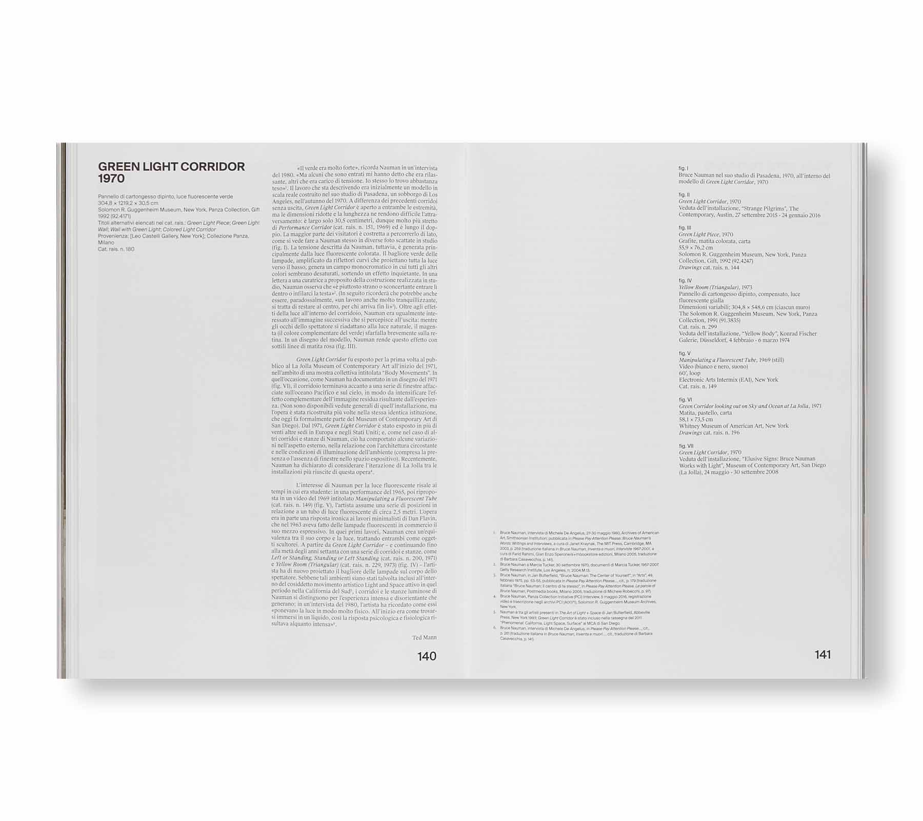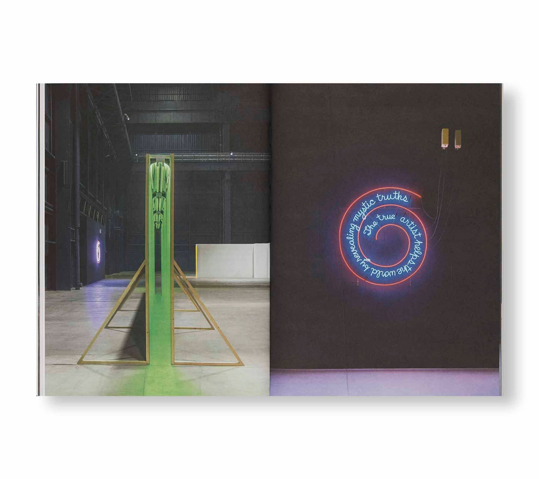 アメリカ人アーティスト、ブルース・ナウマン(Bruce Nauman)の作品集。アメリカのマルチメディアにおける先駆者であり、多大な影響力を持つ作者の新たな空間的、建築的な作品を紹介している。2022年9月から2023年2月にかけてミラノの現代美術館「ピレリ・ハンガービコッカ(Pirelli HangarBicocca)」で開催された展覧会に伴い刊行されたこのモノグラフは、本書の刊行当時において、ニューメキシコでの空間的、建築的作品の最も新しい編纂である。ネオンライト、通路や部屋を用いたインスタレーションを通じ、作者は空間における視覚的かつ身体的経験の対比を強調している。ネオンの光に溢れた狭い通路や、からっぽの部屋を進むという美的体験は、観る者の経験の中にある美術的「オブジェクト」に取って代わり、知覚そのものが作家の作品の主題と解釈することもできる。本書籍はキュレーターのジョアン・サイモン(Joan Simon)、コンサバター(保存修復師)のフランチェスカ・エズメイ(Francesca Esmay)、 現代美術史家のグロリア・サットン(Gloria Sutton)をはじめとした学者、コンサバターやキュレーターたちによる作者の概念的構想や形式の変動に対する新しいエッセイと、展覧会のキュレーターによるテキストが収録されている。さらに本書では展覧会の豊富な記録写真とともに、国際団体の研究者たちによって書き下ろされた30点の展示作品へのキャプション記載や解説も取り上げている。