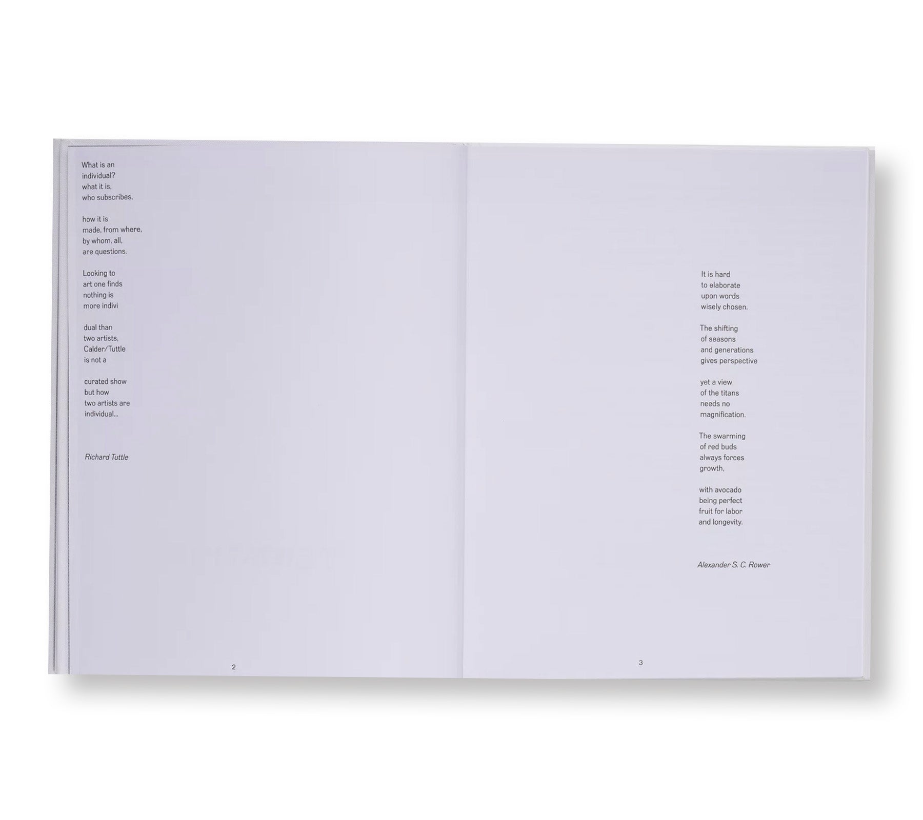 アメリカ人アーティスト、アレクサンダー・コールダー(Alexander Calder)と、同じくアメリカ人アーティスト、リチャード・タトル(Richard Tuttle)の作品集。2023年1月から2月にかけてロサンゼルスの「ペース・ギャラリー(PACE GALLERY)」、「デイヴィッド・コルダンスキー・ギャラリー(David Kordansky Gallery)」で「コールダー財団 (Calder Foundation)」とのコラボレーションのもと同時開催された展覧会に伴い刊行された。