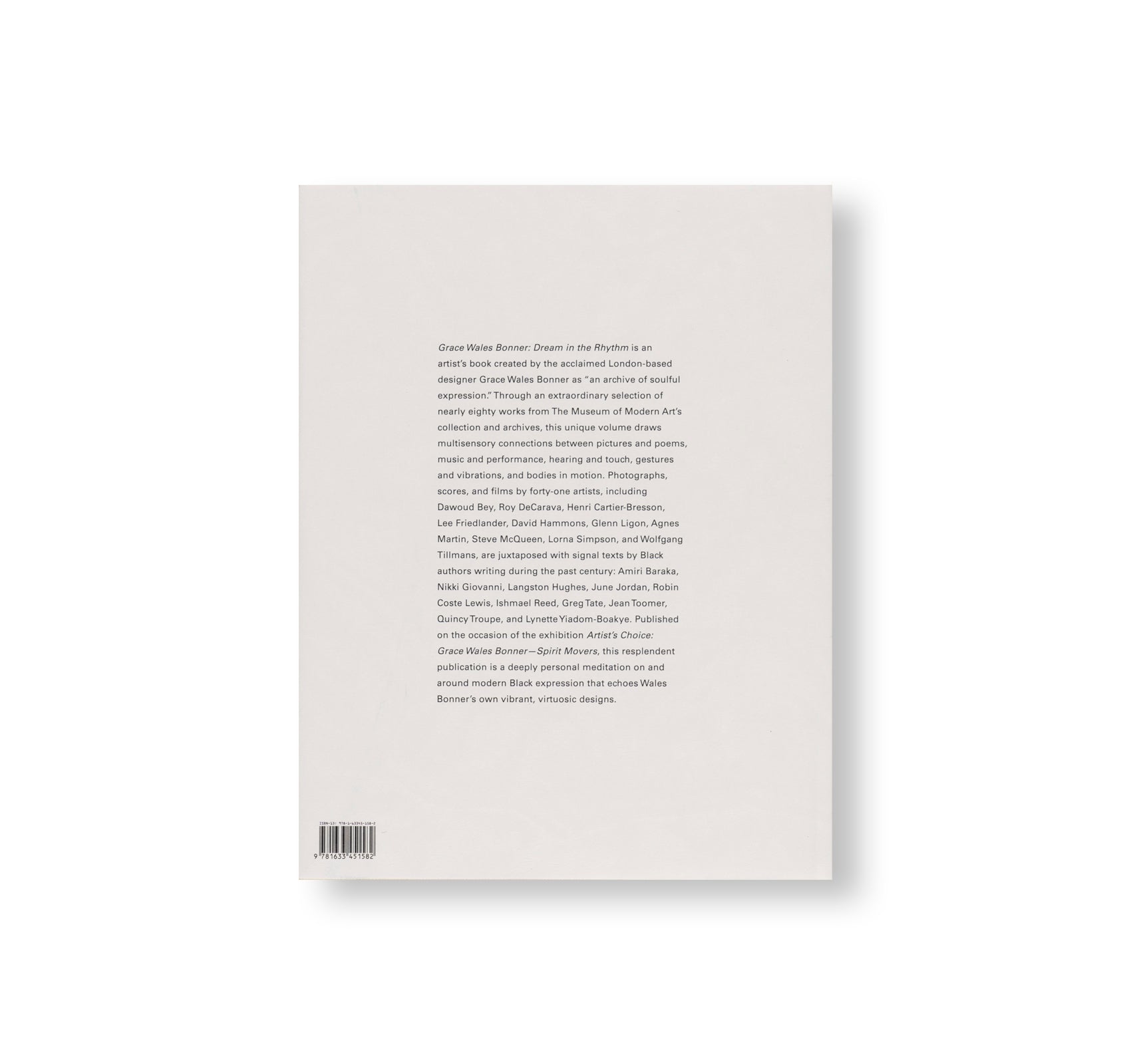 This volume, Grace Wales Bonner: Dream in the Rhythm—Visions of Sound and Spirit in the MoMA Collection, is an artist’s book created by the acclaimed London-based designer Grace Wales Bonner as “an archive of soulful expression.” Through an extraordinary selection of nearly 80 works from The Museum of Modern Art’s collection and archives, this unique volume draws multisensory connections between pictures and poems, music and performance, hearing and touch, gestures and vibrations, and bodies in motion. Photographs, scores and films by artists such as Dawoud Bey, Mark Bradford, Roy DeCarava, Lee Friedlander, David Hammons, Glenn Ligon, Steve McQueen, Lorna Simpson and Ming Smith, among others, are juxtaposed with signal texts by Black authors spanning the past century, including Amiri Baraka, Nikki Giovanni, Langston Hughes, June Jordan, Robin Coste Lewis, Ishmael Reed, Greg Tate, Jean Toomer, Quincy Troupe and Lynette Yiadom-Boakye. Published on the occasion of the exhibition Artist’s Choice: Grace Wales Bonner—Spirit Movers, this resplendent publication is a deeply personal meditation on and around modern Black expression that echoes Wales Bonner’s own vibrant, virtuosic designs.