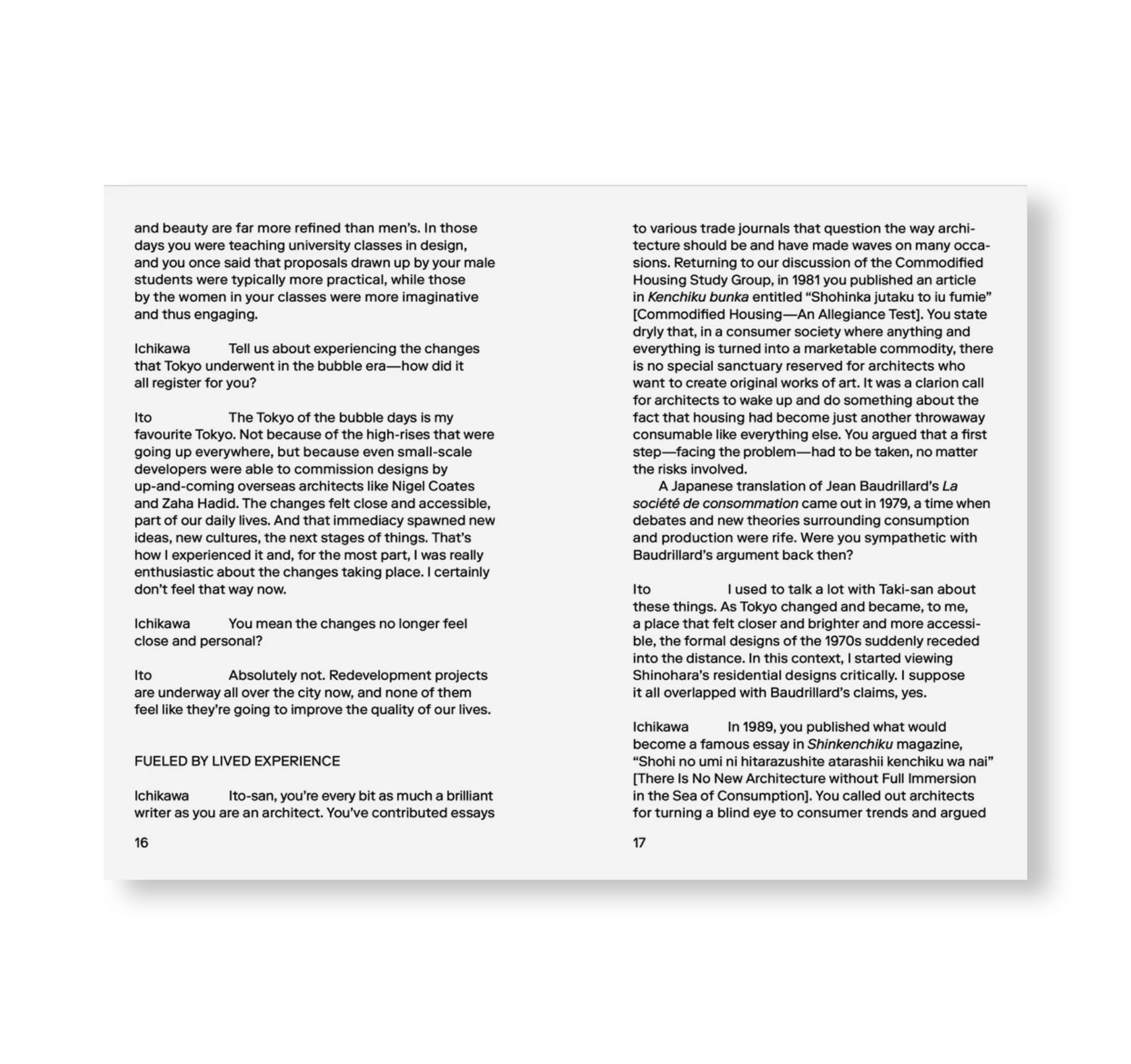 This book is the third volume in a series presenting conversations between a young generation of architects and scholars and key figures of Japanese architecture (Itsuko Hasegawa, Hiroshi Hara and Toyo Ito) of the 1970s and 1980s who attempted to redefine architecture beyond the doctrine of modernism and address the needs of society at large.