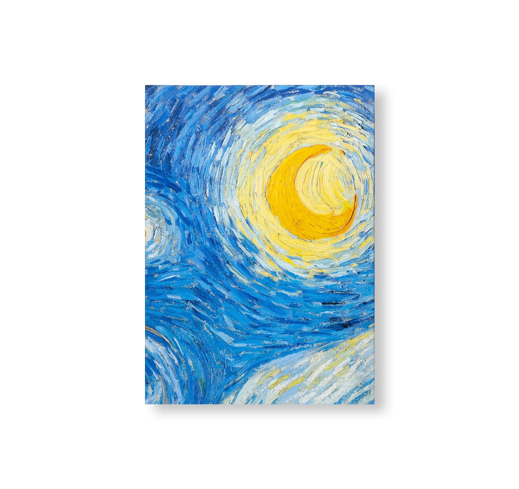 作者の最も主要な作品約50点を収録し、蛇腹を伸ばすとゆったりとしたページにその作品群が描き出す鮮やかな色彩と表現力豊かな筆致が広がり、ページ上に生き生きと蘇る。厚紙に印刷された大判の作品群は年代順に掲載されており、作者の芸術家としての成長過程をじっくりと学ぶことができる。「アイリス(Irises)」、「星月夜(Starry Night)」、「ひまわり(Sunflowers)」、「ファン・ゴッホの寝室(The Bedroom)」、「花咲くアーモンドの木の枝(Almond Blossom)」、「カラスのいる麦畑(Wheatfield with Crows)」などよく知られた作品に加え、風景画、静物画、肖像画の制作における実験的な試み、そして、印象派、新古典主義、点描主義を取り入れ、象徴主義の要素や日本の木版画の技法を用いるなど、その短くも多作なキャリアの中でどのようなものに影響を受け変化をもたらしたのかを知ることができるだろう。